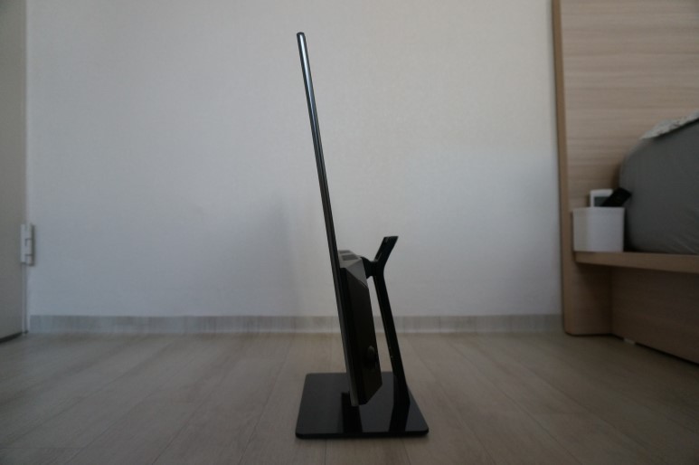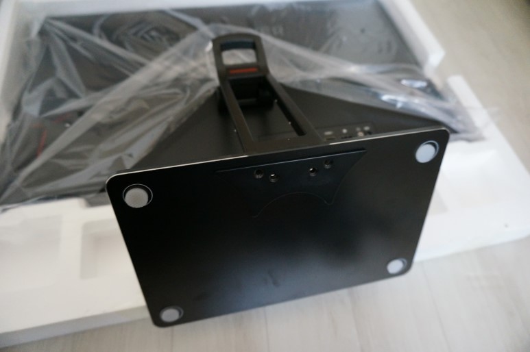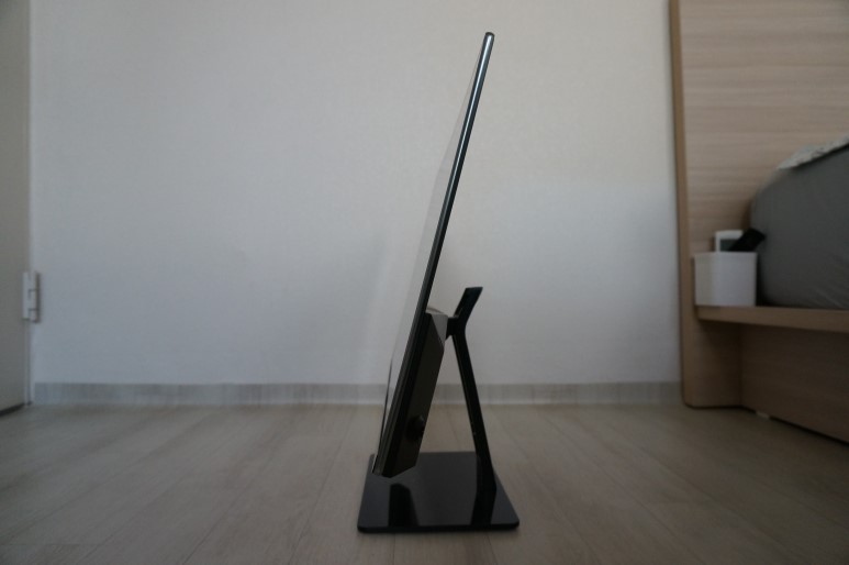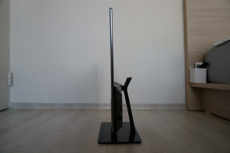 평면형 스탠드 구조로 되어 있어 모니터를 보다 안정적으로 거치할 수 있습니다. 얇아진 두께지만 강화유리 소재가 도입되어 튼튼하고 안전한 구조에 모니터 하단의 공간 활용성도 높일 수 있는 점도 장점입니다. 패널이 얇기 때문에 스탠드의 조립은 제조사에서 권장하는 방법과 같이 패키지 스티로폼 위에서 조립하는 것을 권장합니다.