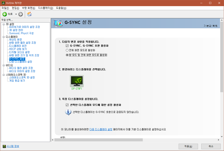티어링과 스터터링은 게임과 모니터의 주사율이 불일치하는 경우 발생하는 이미지 깨짐과 끊김 현상인데요. 게임을 즐기다 이런 현상이 나타나면 매우 거슬리게 됩니다. 이런 현상을 억제하기 위해 본 제품은 프리싱크 기능을 탑재하여 자연스러운 움직임을 구현합니다. 특히 프리싱크 기능은 최근 엔비디아의 G-SYNC가 프리싱크와 호환되는 드라이버 업데이트 이후로 주목받고 있습니다. 일부 호환되지 않는 모니터도 있으나 본 제품은 정상적으로 호환되는 것을 확인할 수 있습니다.