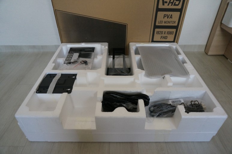 패키지 전면은 군더더기 없이 심플합니다. 모니터의 이미지와 27인치 패널 사용에 대해 홍보하고 있는 것이 확인되는데요. 패키지를 개봉하면 스티로폼에 구성품들이 각자 자리 잡아 가지런히 놓여있는 것을 확인할 수 있습니다. 구성품 중 눈에 띄는 것으로는 VESA 거치대를 별도로 이용하려는 사용자를 배려하여 별도의 거치대 어댑터가 동봉되어 있는 것을 확인할 수 있습니다.